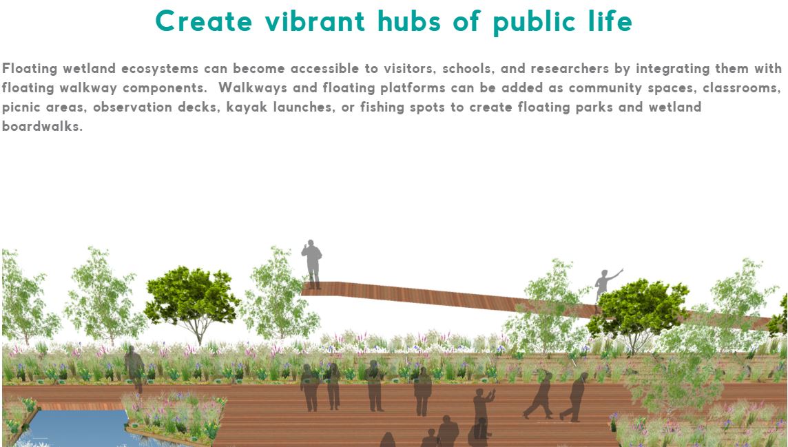 Floating wetland ecosystems can become accessible to visitors, schools, and researchers by integrating them with floating walkway components. Walkways and floating platforms can be added as community spaces, classrooms, picnic areas, observation decks, kayak launches, or fishing spots to create floating parks and wetland boardwalks.